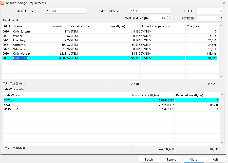 Total Size (Bytes): The total available space and required space on the server for all DataFlex files and indexes.