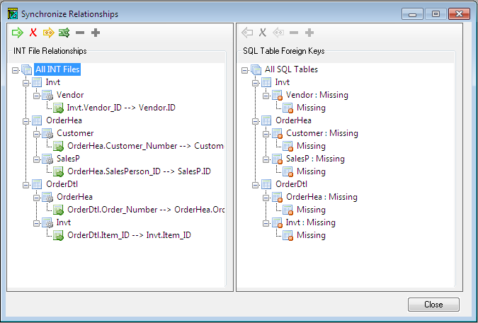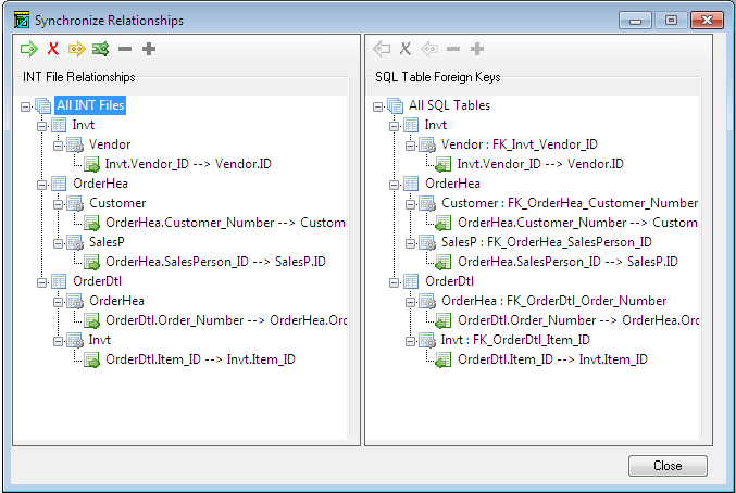 With the Synchronize Relationship option you can also use external tools to create database relationships and then update the .INT file using Synchronize the INT file relationship with the SQL table foreign key (