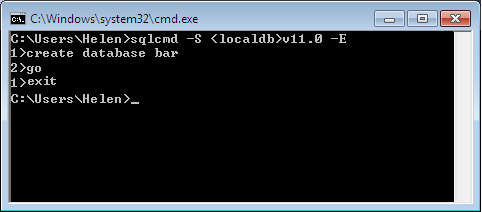 Launch the sqlcmd utility and enter an SQL statement to connect to the LocalDB server (default “(localdb)MSSQLLocalDB”). A trusted connection is used in the example below.