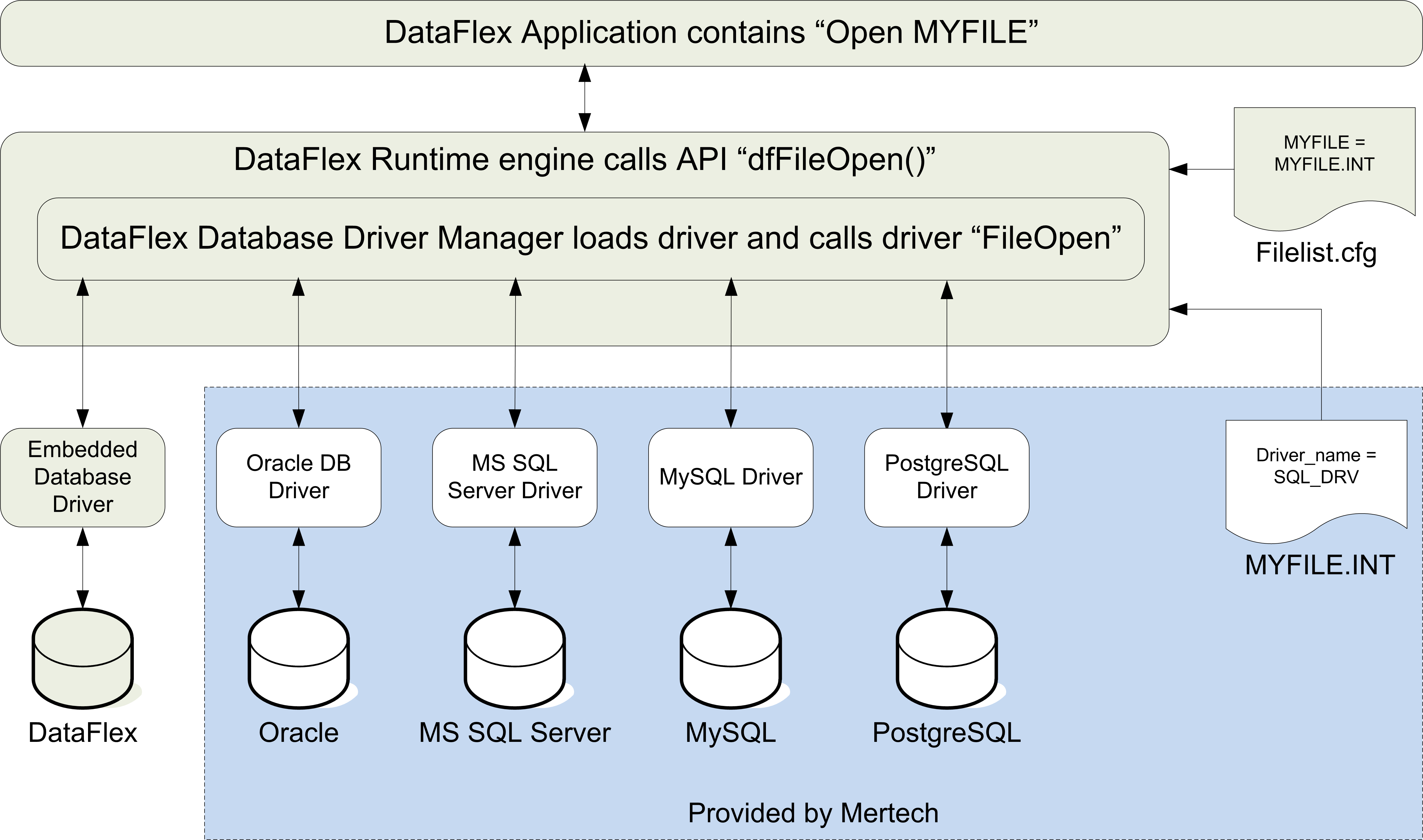 DataFlex, starting with v3.1c allows external database drivers to be loaded as dlls and to work as a part of the runtime. This enables a driver to work with existing DataFlex programs without changing a single line of code. Flex2SQL takes advantage of this runtime environment, and provides database drivers for Oracle, MS SQL Server, MySQL, MariaDB and PostgreSQL.