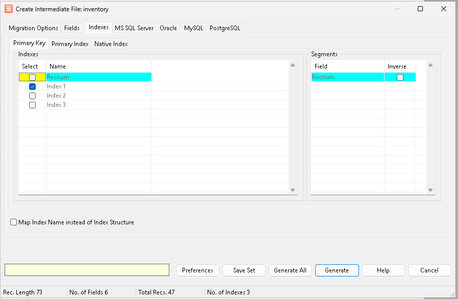 If you wish to make the indexes on the migrated table different than the DataFlex table, use this tab to make those changes. Please use caution when making changes in this tab, see the note below.