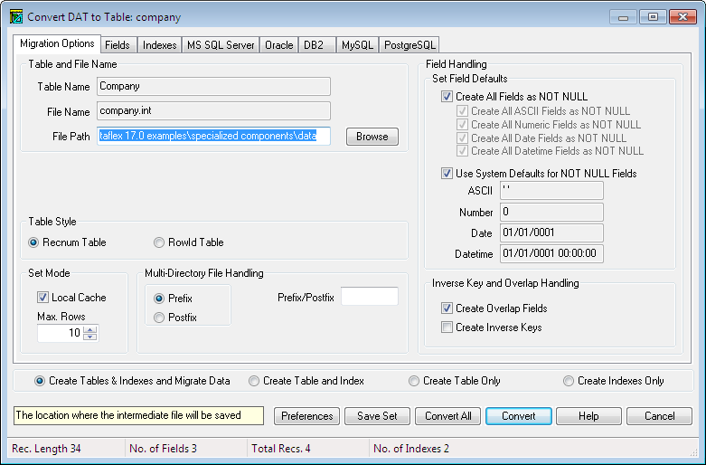 • Create Table and index: This will create the tables and the indexes from the selected .Dat file(s) onto the selected backend. No data will be migrated.