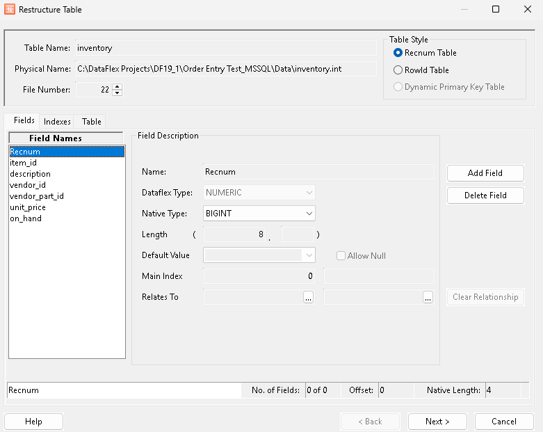 RECNUM table emulates DataFlex record processing where a unique consecutive positive number (record number) is used to identify each record. The record number designates a record’s relative position in the table. This is useful for legacy applications.
