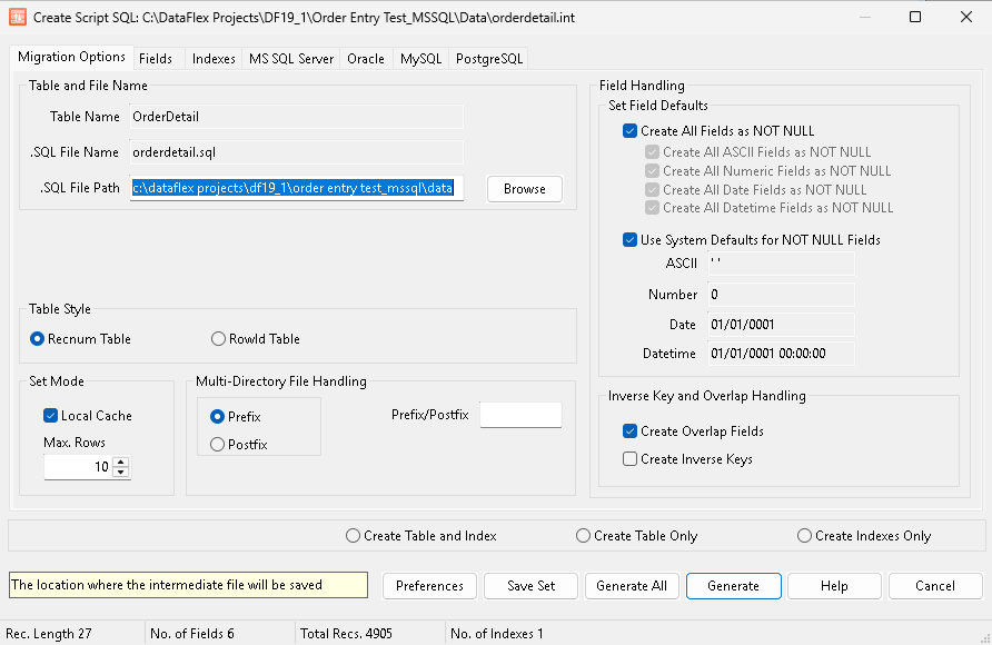 This dialog, which is very similar to Convert Dat to Table and Create Intermediate File, is used to generate SQL scripts which can then be run on deployed systems where using the Flex2SQL Classic Migration Utility is inconvient or impossible.